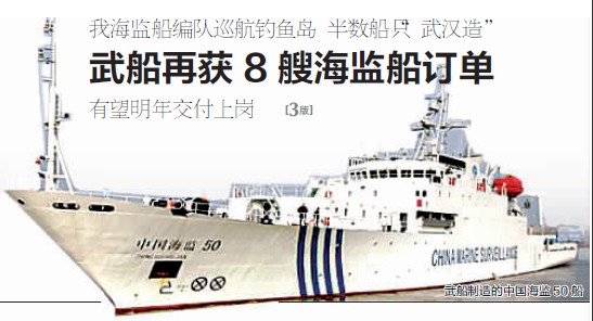 17日获悉,中国重工旗下的武船重工,眼下共获得8艘海监船订单。记者从各方打听得知,这是武船重工第三次进入中国海监船舶建造项目工程。