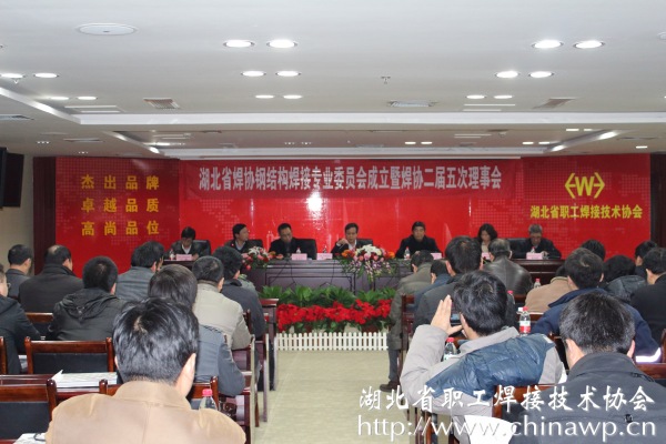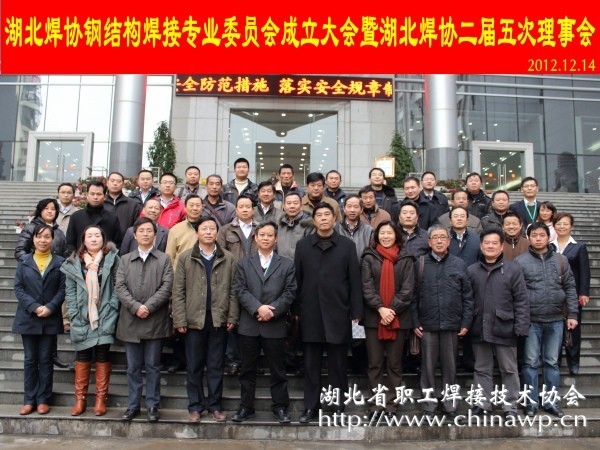 “湖北省职工焊协钢结构焊接专业委员会”成立会暨焊协二届五次理事会于2012年12月14日在武汉新时代商务中心中建三局隆重召开。首届钢结构焊接专委会委员;湖北省职工焊协理事、顾问和领导、嘉宾及新闻媒体单位记者等共70余人参加了会议。湖北省总工会领导吴孝义巡视员、湖北省民政厅社团管理局涂才江副局长,中建三局李勇副局长以及专程从北京赶来的中国工程建设焊接协会刘景凤秘书长莅临大会并发表了热情洋溢的讲话。会议内容紧凑、务实高效,既完成了钢结构焊接专业委员会的成立事宜,又深入总结了湖北焊协2012年度工作开展情况,同时部署了2013年的活动计划,博得了与会代表们的高度赞扬和一致好评。