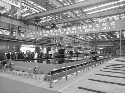 上午9时58分,记者在中船重工武船集团双柳基地看到,焊花飞溅,工人们操纵先进的等离子激光切割机,为马来西亚濒海任务舰首舰切割第一块钢板。