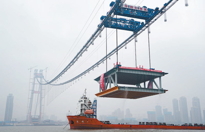 为确保千吨级钢梁的顺利架设,我们研制了国内起重能力最大的LZD900型缆载吊机,每台缆载吊机起重能力达900吨,全桥钢梁采用4台吊机。”杨泗港大桥项目部一分部技术负责人梁显伟介绍,缆载吊机自重约300吨,需在240米的高空分三段拼装而成,吊机本身自重大,高空安装难度大、精度要求高,要达到毫米级对位。在钢梁的提升过程中,施工人员对钢梁的位移和提升拉力要不断监测,实时调整,以保证钢梁平稳安全地提升。