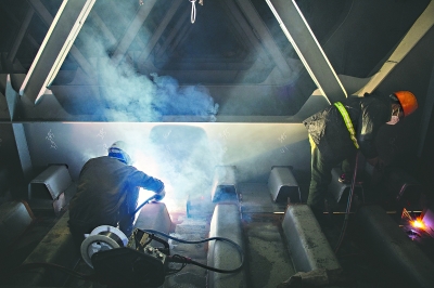 ![]() 焊接工在桥体内工作 长江日报记者任勇 摄