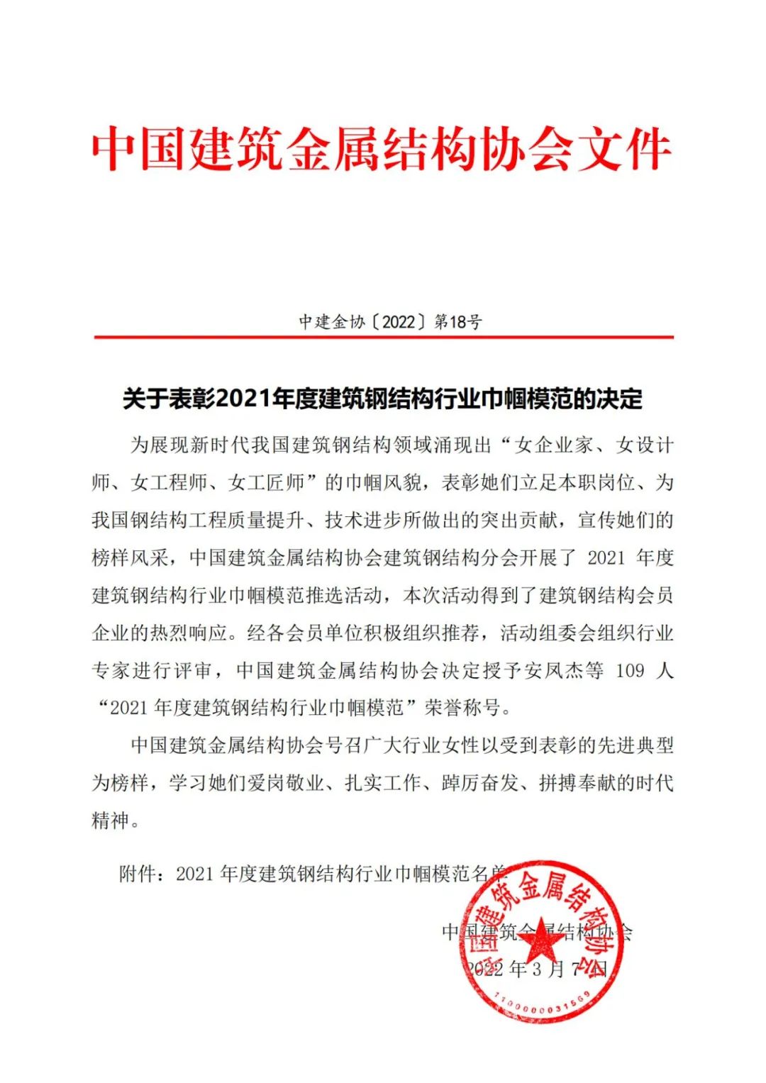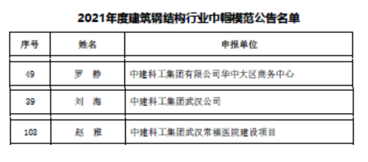 (通讯员:杨杰、黄锋)日前,中国建筑金属结构协会在全国建筑钢结构行业中开展了“巾帼模范”评选活动,旨在展现新时代我国建筑钢结构领域涌现出的“女企业家、女设计师、女工程师、女工匠”的巾帼风貌,表彰她们立足本职、爱岗敬业、为钢结构工程管理水平提升、技术进步所做出的突出贡献。中建科工华中大区推荐的三名巾帼人选,逐鹿群雄,以优秀的业绩脱引而出,荣获全国建筑钢结构行业“巾帼模范”人物荣誉称号,获得殊荣的三人分别是:中建科工华中大区商务中心经理罗静、中建科工武汉公司党总支副书记刘海、中建科工武汉常福医院建设项目设计总监赵雅。