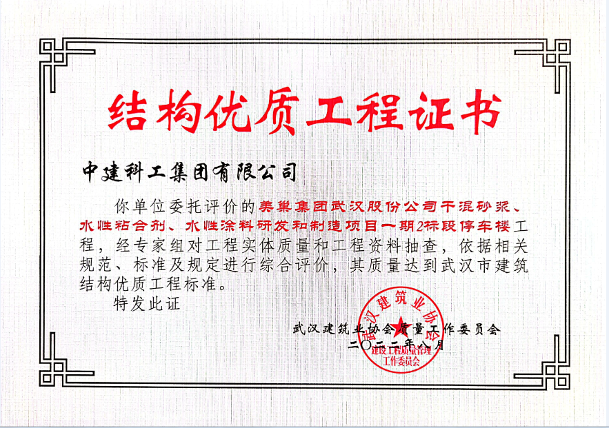 (通讯员:杨杰、黄锋)9月5日,从武汉建筑业协会获悉,由中建科工集团有限公司承建的美巢集团武汉股份公司干混砂浆、水性粘合剂、水性涂料研发和制造项目停车楼工程被评为武汉市建筑结构优质工程。