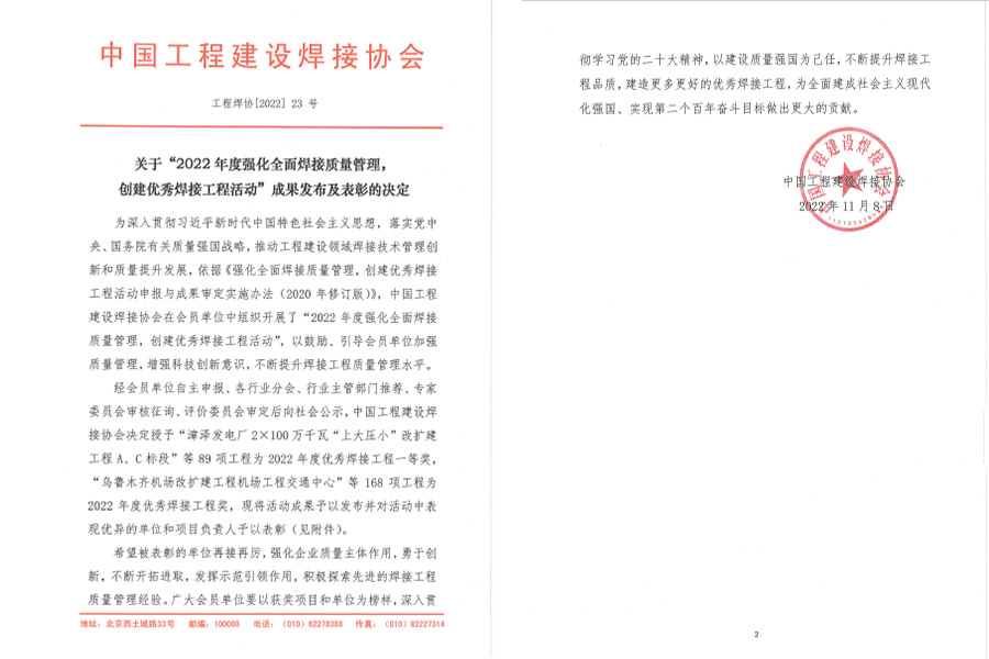 据悉, 该奖项是我国工程建设焊接领域的最高质量奖,每年评审一次,此奖项以工程建设项目焊接质量为主要评定内容,涉及工程建设项目的合法性,工程焊接质量管理的系统性,焊接材料、焊接方法、焊接工艺、焊接技术的先进性、创新性和经济性等。获奖标准均是在设计、施工和质量等方面达到国内先进水平,受到社会各界和相关行业广泛关注的重点工程项目。2022年,全国共有257项工程获优秀焊接工程奖。