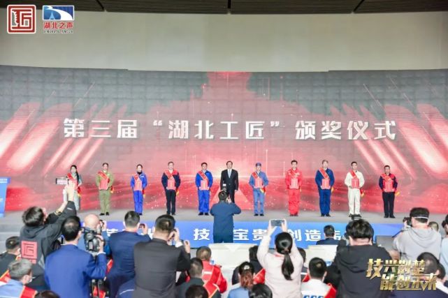 11月17日,湖北省第一届职业技能大赛暨第三届“湖北工匠”表彰大会在汉揭幕,新一批10名“湖北工匠”集体亮相,登台领奖。