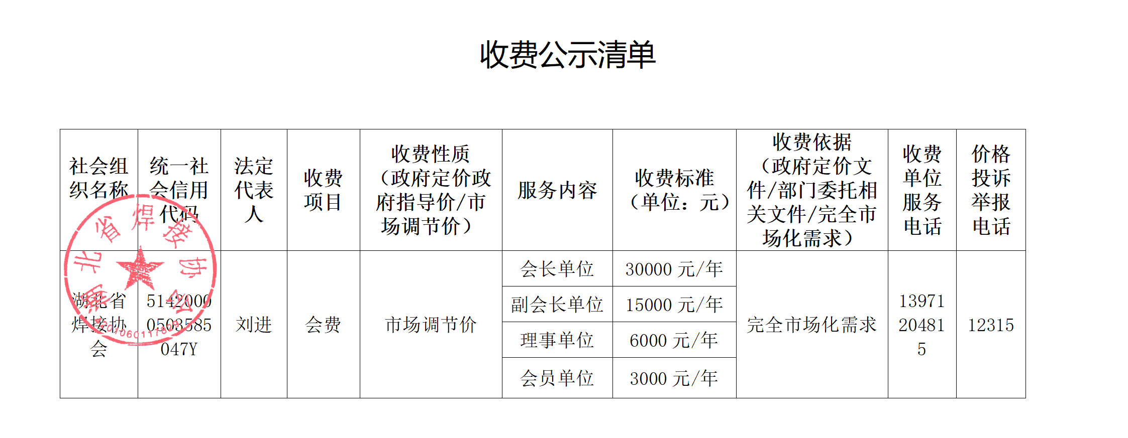 根据《省市场监督管理局 省民政厅关于进一步规范行业协会商会收费公示工作的通知》(鄂市监竞争〔2023〕39)要求,现将湖北省焊接协会第四届理事会会费收取标准(于2019年7月10日湖北省焊接协会第四届一次会员代表大会以无记名投票方式通过)进行公示(公示清单附后),并对收费公示实行动态管理,如收费项目发生变化将及时更新并公示。