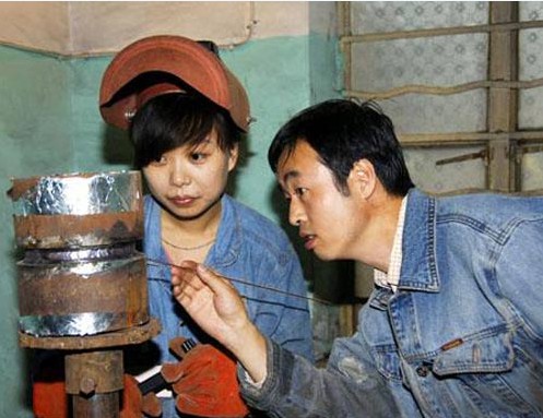 集团公司十大杰出青年马晓东与与焊工能手唐燕一起切磋技艺(资料图)