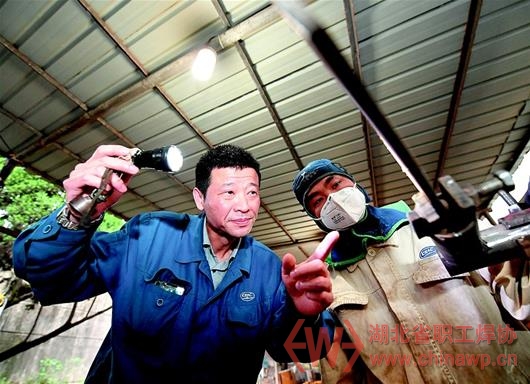 图为:湖北日报全媒记者 王际凯 通讯员 黄玲 瞿鹏代能武(左)指导年轻员工进行焊接。(湖北日报全媒记者 张朋 摄)