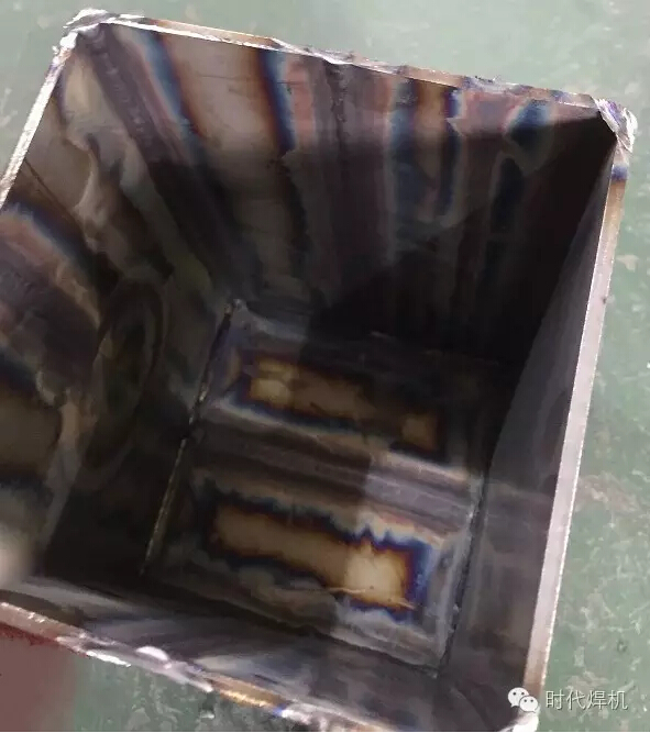 图6:背部融透 对于第三模块中不锈钢结构件的焊接,个人观点是其焊接难点要更甚于铝合金的焊接。众所周知不锈钢在高温状态下非常容易氧化,而且变形量也较大。这次的不锈钢结构件组对完毕后,所有焊缝根据要求都不允许留间隙、开坡口焊接,并在背部充气的情况下实现单面焊双面成型(如图7),它的焊接难点之一首先是为防止变形,如何选择好组对之后的焊接顺序,其次是焊接过程中如何能够保证一次焊接背部成型和表面焊缝成型不氧化,乍听起来好像这两点有些矛盾,首先要想保证在不留间隙的情况向背面焊透,就要使熔池的温度充分达到,而熔池温度一旦过高焊缝表面就很容易氧化发黑,本届比赛各路选手也是各显其能,对于氩弧焊喷嘴的使用从6号嘴到10号甚至更大都有使用。其实从理论上来讲,要想使氩弧焊接不锈钢表面成型好,颜色好,主要就是气体的保护效果,如果比赛允许使用氩气保护拖罩进行三重保护,即热影响区也保护起来,那么焊缝达到银白色的金属光泽也是有可能的,但这次只允许两重保护(即内充气和氩弧枪本身气体),那么对于焊缝的正表面只能采取大口径喷嘴进行,才能扩大保护范围,如果条件允许,也可以采用喷嘴内装有滤网的大口径喷嘴进行焊接,这样的气体保护会更均匀。但前提是采用大喷嘴口径的焊枪对焊接过程中选手对熔池观察的视线会有所影响,也要逐渐适应。这次大赛对于大喷嘴的使用只有少数单位想到了这一点。随着本次大赛的结束,我想以后对于不锈钢焊接的氧化问题,会有更多的单位熟悉、掌握,甚至想出更好的办法来解决不锈钢焊接氧化的问题。