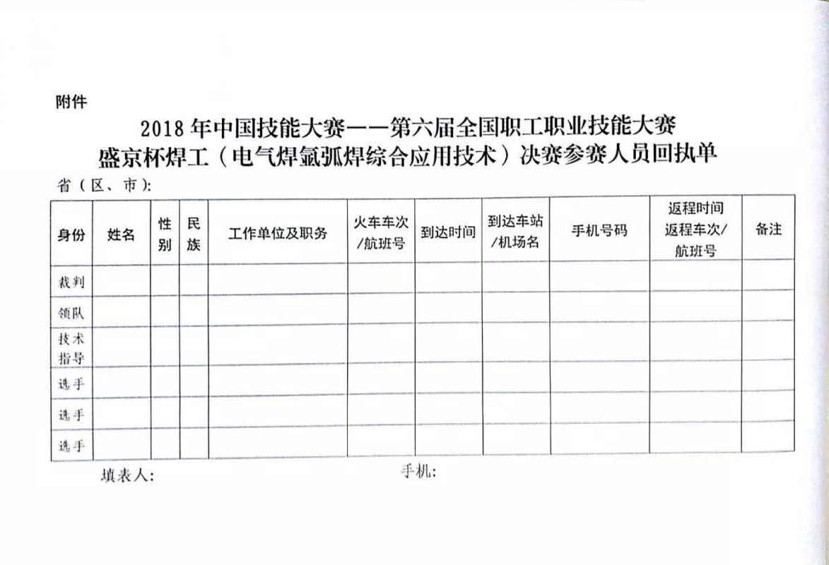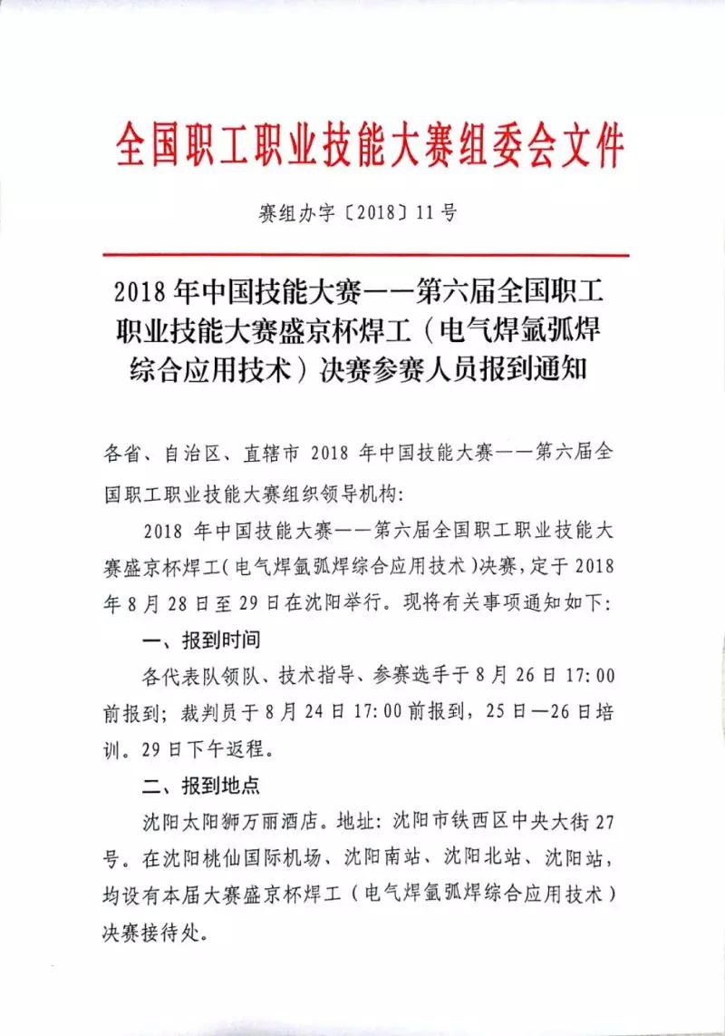 第六届全国职工职业技能大赛盛京杯焊工(电气焊氩弧焊综合应用技术)决赛参赛人员报到通知