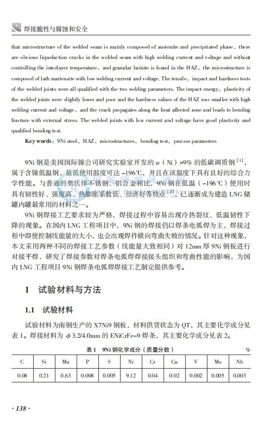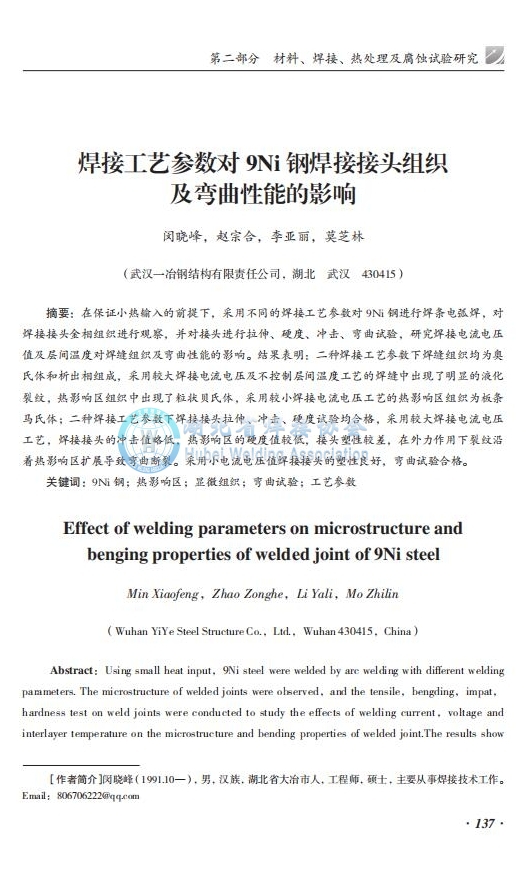 焊接工艺参数对9Ni钢焊接接头组织及弯曲性能的影响