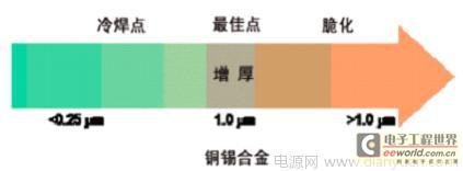 更高温度和与被焊接部件更长时间的接触也可能增加金属化合物的结合层。从而不建议延长接触时间和重复返工。上图表显示了随着结合层的厚度增加,脆化现象发生的机率就更大。