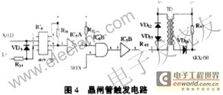 以U相为例,晶闸管触发电路如图4。取自主回路的交流波头信号(X2(1)-L+),经光耦IC8隔离,使6脚输出为低电位,经达林顿反相驱动IC5A反相为高电位。在EIN已为IC6的6脚提供开门信号SEIN的情况下,使IC6B(4)输出高电位,经IC5B反相为低电位,使脉冲高压器TC3的原边产生脉冲信号,副边输出触发信号GU给VT1的门极,使该晶闸管触发导通。当该相波头信号消失时,其触发信号也消失。当U1<L+时,该相晶闸管被负压关断。这样,各相晶闸管顺序开通与关断,完成三相半控整流。