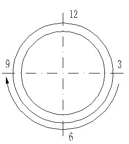 1)管排水平固定焊缝由于位置的特殊性,管于管之间只有十几毫米间隙,因此管子下半部焊接操作难度较大。为了保证根部焊缝熔合良好,在以往焊接方法上经过改进,打底层我们采用从立焊(时钟三点位置)部位内填丝焊至过仰焊位(仰焊位时钟六点位置)收弧,然后在收弧处接头,从接头处焊至立焊(时钟9点位置)。焊接方向示意图见图3