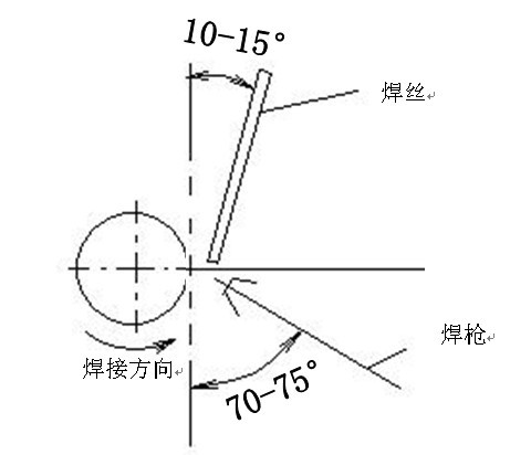 焊接时要严格控制钨极、喷嘴与熔池的位置,即焊枪钨极应垂直于管子轴线,喷嘴至两管的距离要相等,焊丝与通过熔池的切线成10-15°,送入熔池,焊枪角度,焊丝角度见图2。